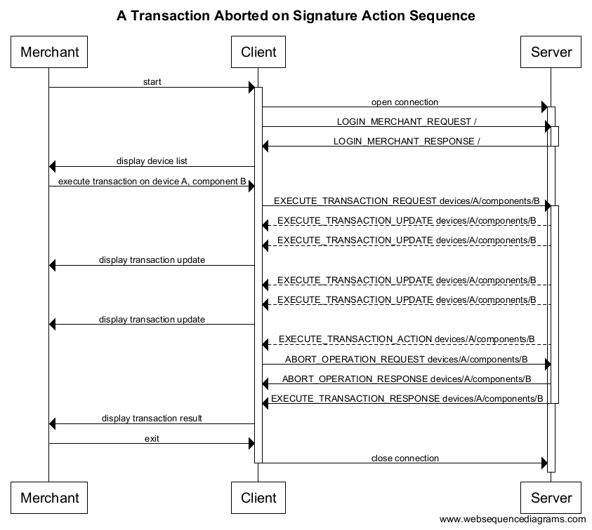 When the PayServer indicates an action, you can also respond with a normal abort flow. The diagram below shows a transaction aborted on signature action sequence message flow.
